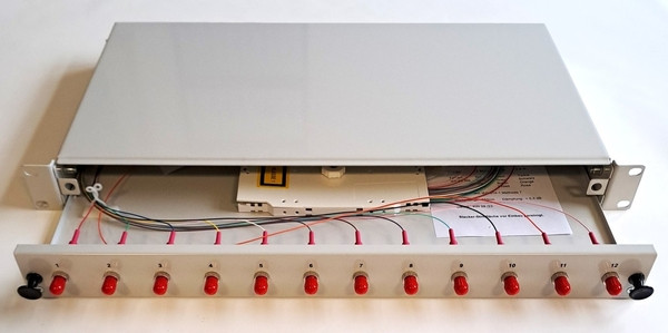 Spleißbox 19" 1HE für 12 x ST, ausziehbar (Schublade), tiefenverstellbar, RAL7035, inkl. 12 Stück Kupplungen ST/ST MM, 1 x Spleißkassette mit Zugentlastung, Spleißhalter, Deckel, 1 x Verschraubung PG16, Pigtails G50/125µ OM3, ST/UPC, farbig, 2m, abgesetzt und aufgelegt