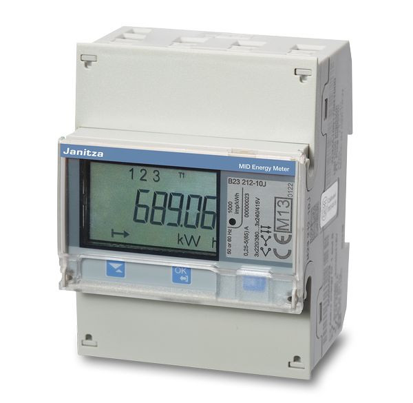 Typ B23 312-10JFür Hutschienenmontage 4TE, 2 TarifeMit integrierter RS485-SchnittstelleModbus RTU2x Eingänge zur Steuerung der Tarifebzw. zur Zählung externer Impulse2x Ausgänge wahlweise alsImpulsausgang für Wirk- oderBlindenergie oder als AlarmausgangImpulslänge: 10-990msMessgenauigkeit Wirkenergie: Kl. 1Messgenauigkeit Blindenergie: Kl. 2(ohne MID)Anschlussquerschnitt Messung: 25mm²Strommessbereich: 0,25 .... 65 ASpannungsbereich: 3x 220-240 AC, -20%-+15%Frequenz: 50/60 HzTemperaturbereich: -40 + 70° CelsiusKeine Rückstellung der EnergiezählerständeZähler ist geeicht nach MID undzugelassen gemäß IEC