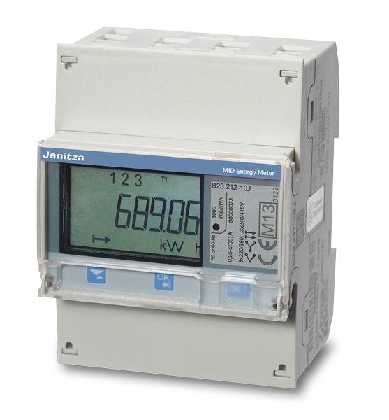 Typ B24 313-10JFür Hutschienenmontage 4TE, 2 TarifeMit integrierter M-Bus Schnittstelle2x Eingänge zur Steuerung der Tarifebzw. zur Zählung externer Impulse2x Ausgänge wahlweise alsImpulsausgang für Wirk- oderBlindenergie oder als AlarmausgangImpulslänge: 10-990msMessgenauigkeit Wirkenergie: Kl. 1Messgenauigkeit Blindenergie: Kl. 2 (ohne MID)Anschlussquerschnitt Messung: 25mm²Wandlerverhältnis: 1/5ASpannungsbereich: 3x 220-240 AC, -20%-+15%Frequenz: 50/60 HzTemperaturbereich: -40 + 70° CelsiusKeine Rückstellung der EnergiezählerständeZähler ist geeicht nach MID undzugelassen gemäß IEC