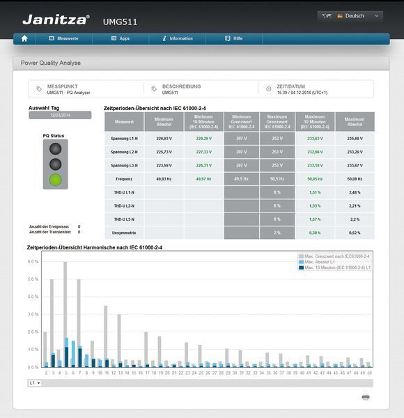Die Norm „IEC 61000-2-4“ legt Grenzen für industrielle und nicht öffentliche Stromverteilungssystemefest. Sie bildet eine Leitnorm für viele Produkt- und Maschinenbaunormen und definiert Immunitätspegelder Spannungsverzerrung, die Maschinen und Anlagen in Industriebetrieben in allen Betriebszuständeneinhalten müssen. Eine Überschreitung dieser Pegel - insbesondere über längere Zeiträume - führt zu Ausfällen, unnötigen Reparaturkosten und eventuellem Produktionsstillstand.Um einen fehlerfreien Betrieb der installierten Anlage und Maschinen zu gewährleisten,muss eine kontinuierliche Überwachung der Spannungsqualität in allen technischen Anlagen nach der IEC 61000-2-4 erfolgen.Die Janitza-APP „IEC 61000-2-4 WATCHDOG“ führt automatisch die komplexe Analyse der Messdaten nach den Grenzwerten der Norm für den Anwender aus.Die integrierte Visualisierung, die nach dem Ampelprinzip konzipiert wurde, erlaubt eine sofortige Erkennung bei Verletzung der Grenzwerte der Norm.