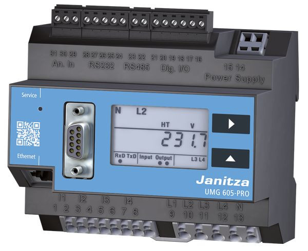 Power Quality AnalyserVersorgungsspannung: 50 .. 110V (45-65Hz); 50 .. 155V DC; Messkategorie: 300V CATIII Messbereich: L - N: 10 -300V; L - L: 17 - 520V; 15 - 440Hz Stromwandler: ../1../5A 2 Digitaleingänge, 2 Digitalausgänge, 1 Temperatur-Messeingang, Zusatz-Speicher: 128MB Flash Schnittstellen: RS232;RS485 Schnittstelle: Profibus D-SUB-9Schnittstelle: Ethernet 10baseTInkl.Web-Server sowie folgenden APP`s:APP Messwertmonitor: Grafische Darstellung von online & historischen Messwerten APP EN 50160 Watchdog PRO: Überwachung der Spannungsqualitäts-Grenzwerte nach EN 50160APP IEC 61000-2-4 Watchdog PRO: Überwachung der Spannungsqualitäts-Grenzwerte nach IEC 61000-2-4Programmiersoftware „ GridVis Basic” download: www.janitza.de/gridvis-download.htmlIm Lieferumfang enthalten: Art.Nr.: 0801505 Cross Patch Kabel, CAT5e, SFTP, 2m, Art.Nr.: 5200008 RS485 Abschlusswiderstand 120OhmArt.Nr.: 3303337 Schnelleinstieg UMG 605 inkl. Sicherheitshinweise inkl. Software-GridVis Schnelleinstieg UMG 605