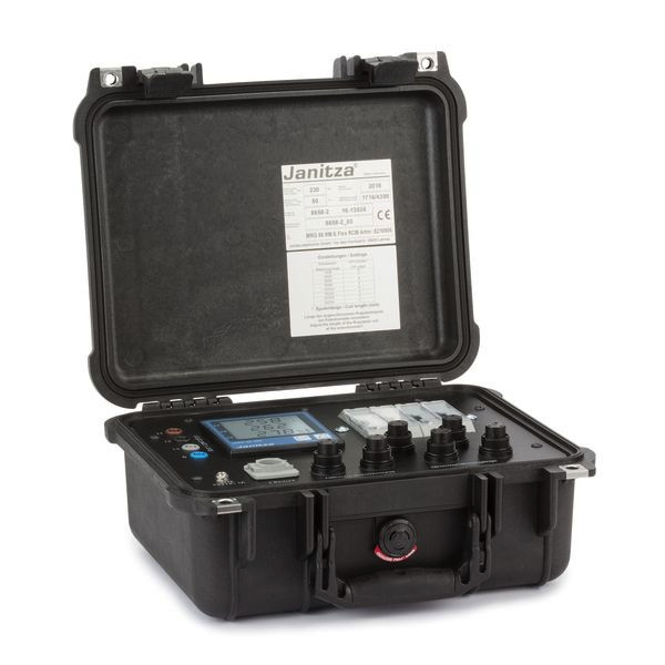 Mobiles Energiemessgerät mit RCM und 4 RogowskispulenMessgerät: UMG 96RM-EKofferausführung: Peli Storm Case Abmessungen: 335x295x145 (BxHxT)Hilfsspannung: 230V ACMessung IT-Netz: 3-phasig (L1...L3)Messbereich IT-Netz : 480VAC (L-L) Frequenzmessbereich: 45 -65 HzHilfsmessung: 1-phasige (L4), Messbereich wie IT/TN/TTSchnittstellen: 01x Ethernet 10/100base-TX (TCP/IP, Modbus TCP, etc.) Inklusive Zubehör: 1x Installations- und Inbetriebnahmeanleitung 1x Cross Patch Kabel, CAT5E (0801505)1x Steckernetzteil 24V DC 24W 1A AC 110-240V 1x Spannungs-Messleitungs-Satz 4x(0801902)3x Spannungs-Messabgriffe (Klemmen schwarz) inkl. Sicherungen (1011510)1x Messabgriff N (Klemme blau) (1011511)1x Janitza Umhängetasche für das Zubehör (1506900)2x Anschlusskabel 3m für Differenzstrommessung 4x Rogowski-Spulen (1503604) Einstellbereich: 100A / 250A / 400A / 630A / 1.000A / 1.500A / 2.000A / 4.000A Durchmesser: 95mm
