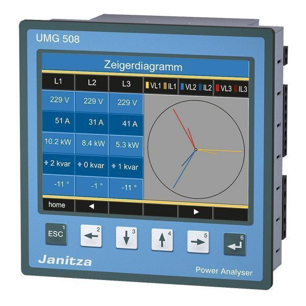 Power Analyser UMG 508Versorgungsspannung: 95 - 240V (50/60Hz); 80 - 340V DC Installationskategorie: 300V CATIII4 Spannungsmesseingänge, Messkategorie: 600V CATIIIMessung in Dreiphasen-4-Leitersystemen bis 417V/720V (IEC) Messung in Dreiphasen-4-Leitersystemen bis 347V/600V (UL) Messung in Dreiphasen-3-Leitersystemen bis 600V, Messbereich: L - N: 10 - 600V; 40 - 70Hz Messbereich: L - L: 18 - 1000V; 40 - 70Hz4 Strommesseingänge für Stromwandler ../1 oder ../5A Messkategorie: 300V CATIII Messbereich: 0,001 .. 7,4Arms, 8 Digitaleingänge, 5 Digitalausgänge, Datenspeicher: 256MB Flash, Schnittstellen: RS485, Profibus DP V0, Ethernet 10/100 BaseTXZubehör:- Art.Nr.: 5219301, 2 Befestigungsklammern - Art.Nr.: 0801505, Cross-Patch-Kabel, CAT5e, 2m,- Art.Nr.: 3303092, Installations- und InbetriebnahmeanleitungProgrammiersoftware „ GridVis Basic” download: www.janitza.de/gridvis-download.html