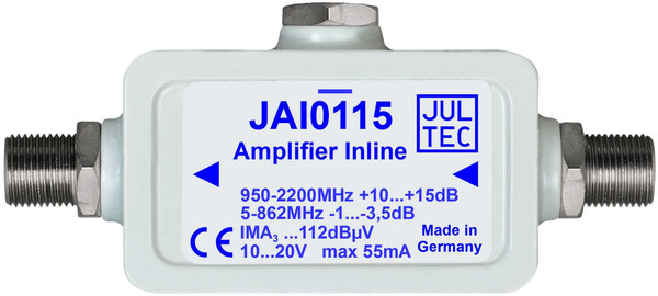 Inline-Verstärker für die erste Satelliten-Zwischenfrequenz. Durch einen integrierten passiven Pfad für die Terrestrik kann der Verstärker sowohl in reinen Satellitenleitungen, als auch in Teilnehmerableitungen mit Terrestrik eingesetzt werden. Der terrestrische Pfad bleibt auch dann erhalten, wenn keine Fernspeisung anliegt.