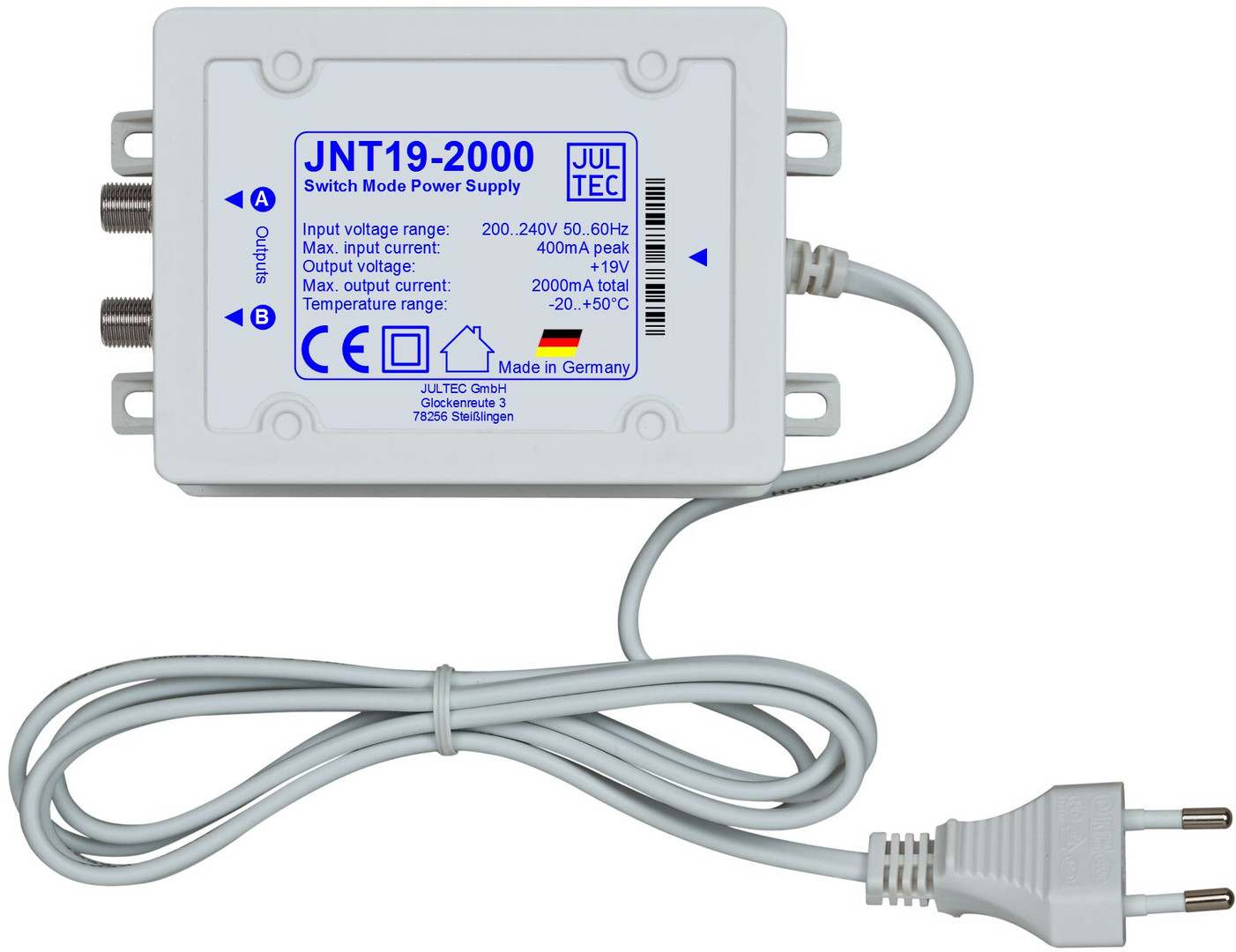 Schaltnetzteil zur Ergänzung der JULTEC-Verteilkomponenten. Das Netzteil ist dabei nicht nur mechanisch optimiert und für den Einsatz mit JULTEC-Komponenten maßgeschneidert, sondern besonders robust und langlebig ausgelegt. Darüber hinaus hält dieses Netzteil die strengen EMV- und Sicherheitsanforderungen der Antennenverteiltechnik und die EUP-Richtlinie (2019/1782) ein. Das Netzteil ist mit zwei gleichberechtigten F-Buchsen ausgestattet, so dass auch mehrere Geräte aus einem Netzteil versorgt werden können (z.B. ein "JPS" und ein "JAC"). Die Ausgangsbuchsen des Netzteils haben die gleiche mechanische Anordnung wie die Verteilkomponenten, so dass das Netzteil mit dem hochwertigen Schnellverbinder JFQ1 direkt auf ein Gerät aufgeschoben werden kann. Ebenso ist eine Verlängerung mit handelsüblichem F-Antennenkabel möglich. Die F-Anschlüsse sind beide HF-terminiert, d.h. mit dem Netzteil können Stammleitungen abgeschlossen werden (keine HF-Durchschleifung!). Verteilkomponenten, welche für den eigenen Betrieb ein Netzteil benötigen (z.B. Startverstärker JAL), werden immer mit Netzteil ausgeliefert.