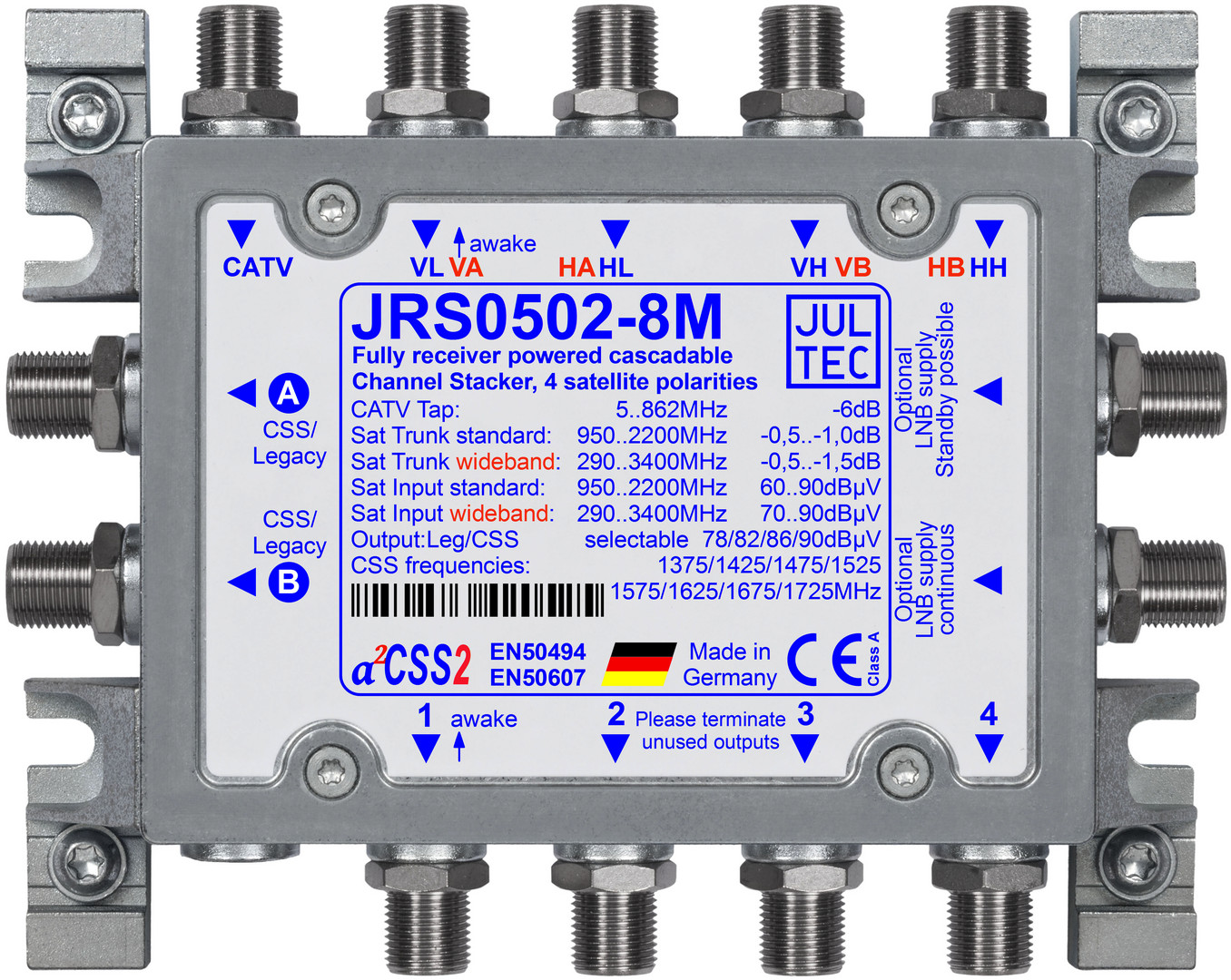 Der JRS0502-8M von Jultec ist ein leistungsstarker Einkabel-Multischalter, konzipiert für receivergespeiste Verteilnetze in SAT-Anlagen. Er eignet sich ideal für die Versorgung von bis zu acht Empfangsgeräten über zwei Ausgänge - ganz ohne separates Netzteil.Energieeffizient: Kein Netzteil erforderlich - der Multischalter wird direkt über die angeschlossenen Receiver mit Strom versorgt. Dadurch entstehen keine Standby-Verluste. a²CSS2-Technologie: Fortschrittliche Einkabelumsetzung mit konfigurierbaren Parametern wie Ausgangspegel, Userband-Frequenzen und Breitbandzuführung. Zwei Ausgänge mit je 8 Userbändern: Ideal für bis zu 8 Receiver, 4 Twin-Receiver, 2 Quad-Receiver oder 1 Octo-Receiver. Legacy-Unterstützung: Automatische Umschaltung für klassische DVB-S/S2-Receiver mit 14V/18V/22kHz-Steuerung. Kaskadierbar: Stammleitungs-/Kaskadenausgänge für SAT-ZF ermöglichen die Erweiterung der Anlage.Kabelfernsehen kompatibel: Auch für die Verteilung von Kabelfernsehen inklusive DOCSIS 3 geeignet. Frequenzbereiche: SAT-ZF: 950-2200 MHz, Breitbandmodus: 290-3400 MHz, Terrestrisch: 5-862 MHz. Entkopplung: SAT: >26 dB, Terrestrisch: >35 dB. Ausgangspegel (konfigurierbar): 78 / 82 / 86 / 90 dBµV, LNB-Versorgung: 9 V / 300 mA, Maximale Receiverlast: 185 mA + LNB, Abmessungen: 131 × 104 × 34 mm, EMV-Schirmung: Klasse A gemäß EN 60728-2. Text mit KI erzeugt