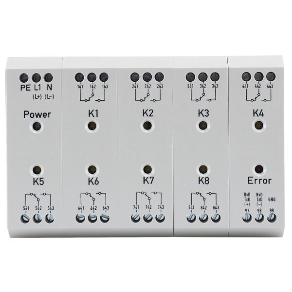 Die externe Relaisbaugruppe liegt im Spannungsversorgungbereich von AC/DC 20 bis 53 V und ist für die Hutschienenmontage geeignet. Mit dieser externen Baugruppe können spezielle Geräte um acht Relais erweitert werden. Die Ansteuerung erfolgt über die Schnittstelle RS422/RS485. Für die Konfiguration ist das dafür vorgesehene Setup-Programm zur Konfiguration notwendig.
