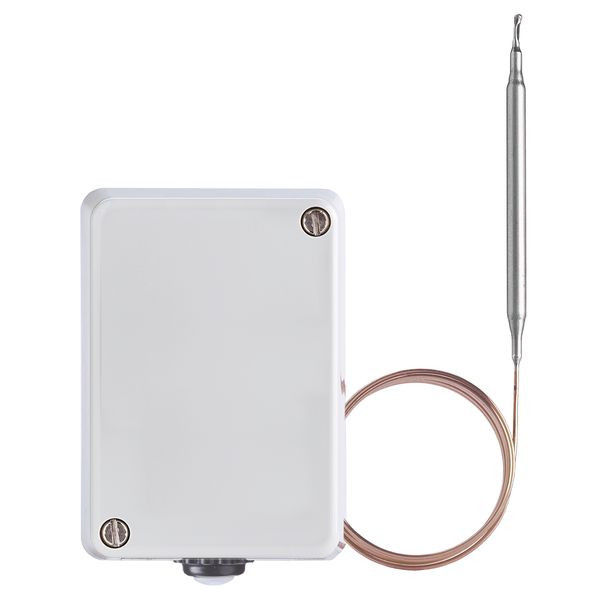 Durch sein schlagfestes Gehäuse mit hochwertigem Kunststoffdeckel und Aludruckguss Unterteil ist der 1-polige mechanische Aufbaubauthermostat sehr robust und kann auch unter rauen Bedingungen eingesetzt werden. Das verwendete Messsystem arbeitet nach dem Flüssigkeitsausdehnungsprinzip und kann bis zu einer maximal zulässigen Fühlertemperatur von 345 °C problemlos eingesetzt werden. Der glatte Rundfühler aus Edelstahl hat einen Durchmesser von 6 mm bei einer Fühlerlänge von ca. 63 mm. Die Fernleitung des Thermostaten ist aus Kupfer und kann unter Beachtung eines Biegeradius von 5 mm flexibel verlegt werden. Die maximal zulässige Umgebungstemperatur am Gehäuse (Schutzart IP54) beträgt 80 °C. Mit Hilfe eines Schraubendrehers kann die gewünschte Abschalttemperatur nach Abnahme des Gehäusedeckels innenliegend auf einer Skala einfach eingestellt werden. Der Temperaturwächter zeichnet sich durch eine hohe Schaltpunktgenauigkeit von +/-1,5 % im oberen Skalendrittel aus. Ein entscheidender Vorteil ist es, dass zur Temperaturmessung keine zusätzliche Hilfsenergie benötigt wird. Der elektrische Anschluss erfolgt durch Schraubklemmen direkt am verbauten Microschalter, der eine maximal zulässige Schaltleistung von AC 230 Volt / 10 A direkt schalten kann. Der Thermostat hat eine Schaltdifferenz (Hysterese) von ca. 3 bis 4 % des Skalenumfangs und schaltet nach Unterschreiten der Abschalttemperatur um diesen Wert automatisch wieder zurück in den Ursprungszustand. Der Temperaturwächter ist sehr flexibel einsetzbar und findet Anwendung sowohl in der Heizungs-, Klima-, und Lüftungstechnik als auch in der Kunststoffindustrie, dem Apparate- und Maschinenbau sowie im Ofenbau und zur Temperaturüberwachung in Labor und Klimaschränken. Das Gerät ist zugelassen gemäß DIN EN 14597 und hat eine EAC Zulassung.