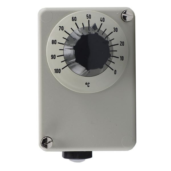 Durch sein schlagfestes Gehäuse mit hochwertigem Kunststoffdeckel und Aludruckguss Unterteil ist der 1-polige mechanische Aufbaubauthermostat sehr robust und kann auch unter rauen Bedingungen eingesetzt werden. Das verwendete Messsystem arbeitet nach dem Flüssigkeitsausdehnungsprinzip und kann bis zu einer maximal zulässigen Fühlertemperatur von 125 °C problemlos eingesetzt werden. Das Tauchrohr aus hochwertigem Edelstahl (Werkstoff Nr. 1.4571) hat einen Durchmesser von 8 mm. Die Befestigung erfolgt durch ein Gewinde G 1/2 Form A nach DIN 3852/2. Die maximal zulässige Umgebungstemperatur am Gehäuse (Schutzart IP54) beträgt 80 °C. Mit Hilfe eines Sollwertstellers kann die gewünschte Abschalttemperatur auf einer Skala einfach eingestellt werden. Der Temperaturregler zeichnet sich durch eine hohe Schaltpunktgenauigkeit von +/-1,5 % im oberen Skalendrittel aus. Ein entscheidender Vorteil ist es, dass zur Temperaturmessung keine zusätzliche Hilfsenergie benötigt wird. Der elektrische Anschluss erfolgt durch Schraubklemmen direkt am verbauten Microschalter, der eine maximal zulässige Schaltleistung von AC 230 Volt / 10 A direkt schalten kann. Der Thermostat hat eine Schaltdifferenz (Hysterese) von ca. 3 bis 4 % des Skalenumfangs und schaltet nach Unterschreiten der Abschalttemperatur um diesen Wert automatisch wieder zurück in den Ursprungszustand. Der Temperaturregler ist sehr flexibel einsetzbar und wird sowohl in der Heizungs-, Klima-, und Lüftungstechnik als auch in der Kunststoffindustrie, dem Apparate- und Maschinenbau sowie im Ofenbau und zur Temperaturüberwachung in Labor und Klimaschränken angewandt. Das Gerät ist zugelassen gemäß DIN EN 14597 und hat eine EAC Zulassung.