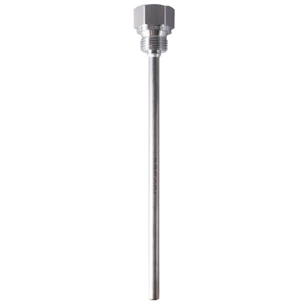 Die Schutzhülse zum Einschrauben aus Edelstahl (Werkstoff Nr. 1,4571) ist passend für einen Fühler mit Durchmesser 6 mm. Montiert wird die Hülse mit einem Gewinde G 1/2 Form A gemäß DIN 3852/2. Die maximale Druckbelastbarkeit bei einer Temperatur von 150 °C beträgt 88 bar.