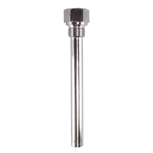 Die Schutzhülse zum Einschrauben aus Edelstahl (Werkstoff Nr. 1,4571) ist passend für zwei Fühler mit Durchmesser 6 mm. Montiert wird die Hülse mit einem Gewinde G 1/2 Form A gemäß DIN 3852/2. Die maximale Druckbelastbarkeit bei einer Temperatur von 150 °C beträgt 26 bar.