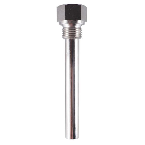 Die Schutzhülse zum Einschrauben aus Edelstahl (Werkstoff Nr. 1,4571) ist passend für zwei Fühler mit Durchmesser 6 mm. Montiert wird die Hülse mit einem Gewinde G 1/2 Form A gemäß DIN 3852/2. Die maximale Druckbelastbarkeit bei einer Temperatur von 150 °C beträgt 26 bar.