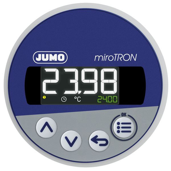 Der elektronische Thermostat ist als Heiz- oder Kühlthermostat oder optional als PID-Zweipunktregler einsetzbar und erfasst die Prozessgrößen über ein Widerstandsthermometer. Beim Einsatz als PID-Zweipunktregler sind die Reglerstrukturen P, I, PD, PI und PID möglich. Das Gerät ist mit einem Relaisausgang (16 A) ausgestattet. Die runde Gehäusebauform ermöglicht es, das Gerät überall dort einzusetzen, wo bisher runde Zeigerinstrumente im Einsatz waren. Das Gerät zeichnet sich durch eine einfache, klar strukturierte und mit Texten unterstützte Bedienung in den Landessprachen Deutsch, Englisch, Französisch und Spanisch aus. Prozesswerte, Texte und Parameter werden in zwei 18-Segment-LCD-Anzeigen dargestellt. Zusätzliche Anzeigeelemente informieren über die Schaltstellung des Ausgangs, den Timerstatus und die Temperatureinheit. Steckbare Klemmleisten mit Push-in-Technologie ermöglichen eine schnelle elektrische Installation. Die Bedienung, Parametrierung und Konfiguration erfolgt über eine Folientastatur mit vier Tasten. Mit Hilfe des Setup-Programms ist das Gerät komfortabel mit einem PC konfigurierbar. Während der Konfiguration über die USB-Schnittstelle ist keine separate Spannungsversorgung erforderlich (USB-powered).