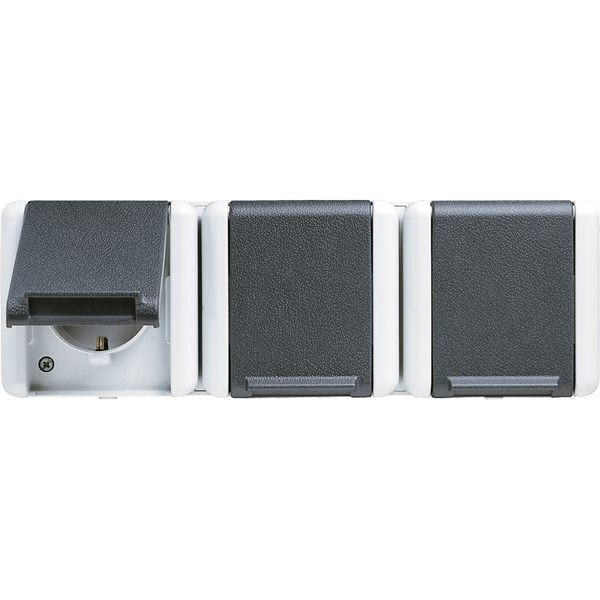 | Kurzbeschreibung | SCHUKO®-Dreifach-Steckdose, verdrahtet, 16 A 250 V ~, waagerecht, IP 44, WG 800, anthrazit |