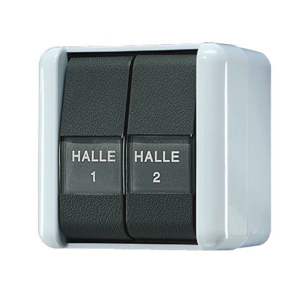 | Kurzbeschreibung | Doppeltaster, 2 Wechsler, mit Schriftfeldern, IP 44, WG 800 |
