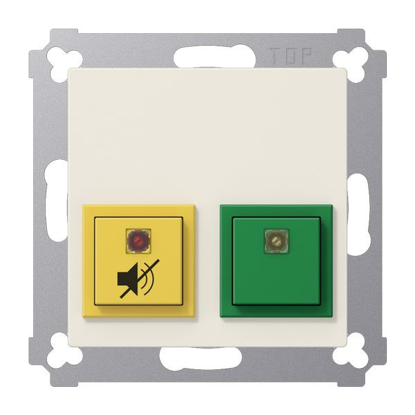 Die Dienstzimmereinheit kann zusätzlich zu den Komponenten des Notrufsets installiert werden, z.B. in einem Personal- oder Empfangsraum. Eine grüne Taste markiert die Anwesenheit, eine gelbe Taste unterdrückt das akustische Notrufsignal des Rufmoduls für 20 Sekunden.