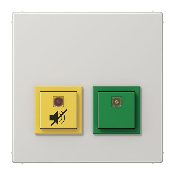 Die Dienstzimmereinheit kann zusätzlich zu den Komponenten des Notrufsets installiert werden, z.B. in einem Personal- oder Empfangsraum. Eine grüne Taste markiert die Anwesenheit, eine gelbe Taste unterdrückt das akustische Notrufsignal des Rufmoduls für 20 Sekunden.