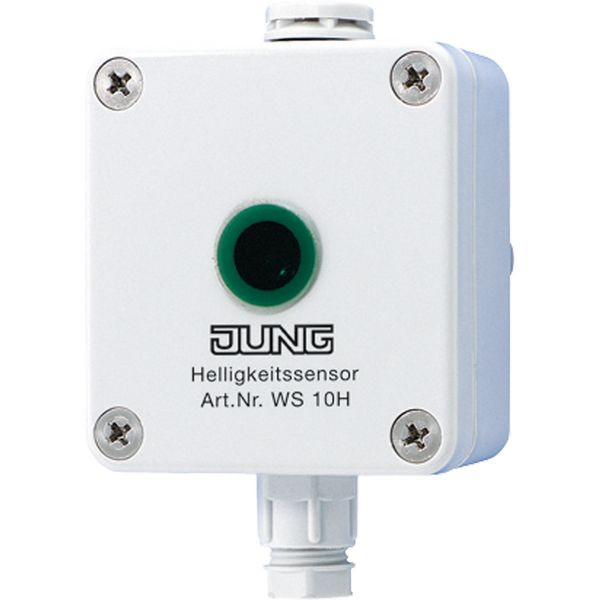 Funktion: Mit den drei Messwertaufnehmern Helligkeits-, Dämmerungs- und Temperatursensor werden je nach Sensortyp die klimatischen Daten aufgenommen und in analoge Spannungssignale (0 ... 10 V) umgewandelt. Zur Auswertung dieser Signale wird der Analogeingang benötigt, welcher in Abhängigkeit der analogen Signale Messwert- oder Befehlstelegramme auf den KNX senden kann. Die Sensoren sind zur Verhinderung von Feuchtigkeitsbildung im Gehäuse mit Druckausgleichselementen (Klimamembran) ausgestattet.