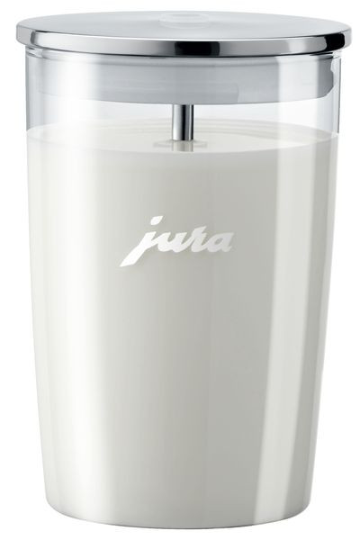 Milchbehälter mit 0,5 l Volumen, spülmaschinentauglich, bequem und einfach zu reinigen; Perfekt auf die Designsprache von JURA abgestimmt, lässt er sich leicht im Kühlschrank verstauen und bei Bedarf an den Vollautomaten anschließen. Vollautomaten anschließen.