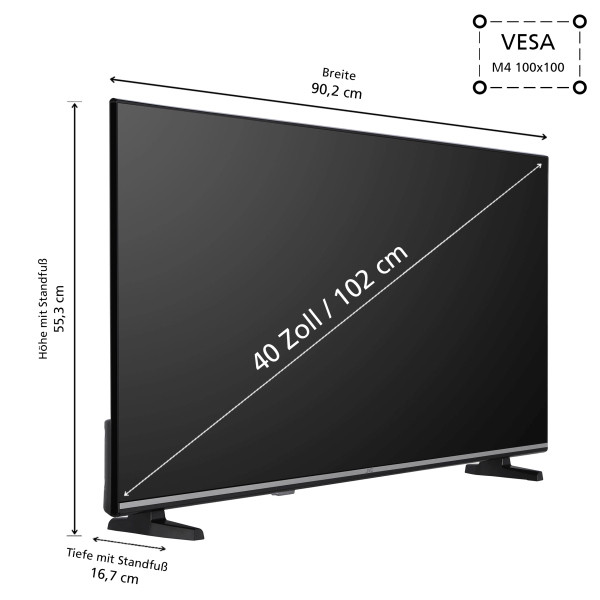 40 Zoll / 102 cmFull HD (1.920 x 1.080)VIDAAHDR10 + HLG2x HDMI, 1x USB, Digitaler Audio Ausgang, LAN, CI-SchachtWLANAusgangsleistung 2x8 WattDolby Digital Plus (DD+)VESA M4 100x100
