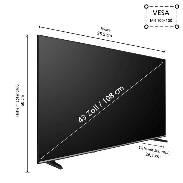 43 Zoll / 108 cm4K UHD (3.840 x 2.160)VIDAADolby Vision HDR + HDR10 + HLG3x HDMI, 2x USB, Digitaler Audio Ausgang, LAN, CI-SchachtWLANAusgangsleistung 2x8 WattDolby AudioHD+