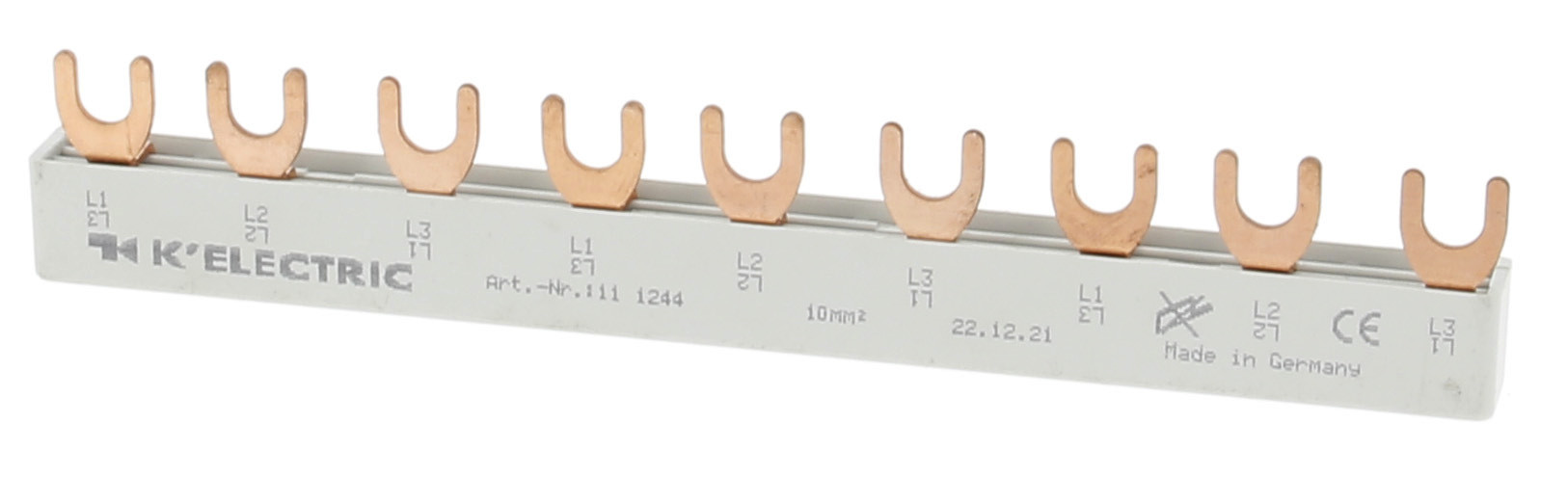 | Kurzbeschreibung | Gabel-Verdrahtungsschiene, 3-polig, 10mm², 9TE, zzgl. Metallzuschläge |