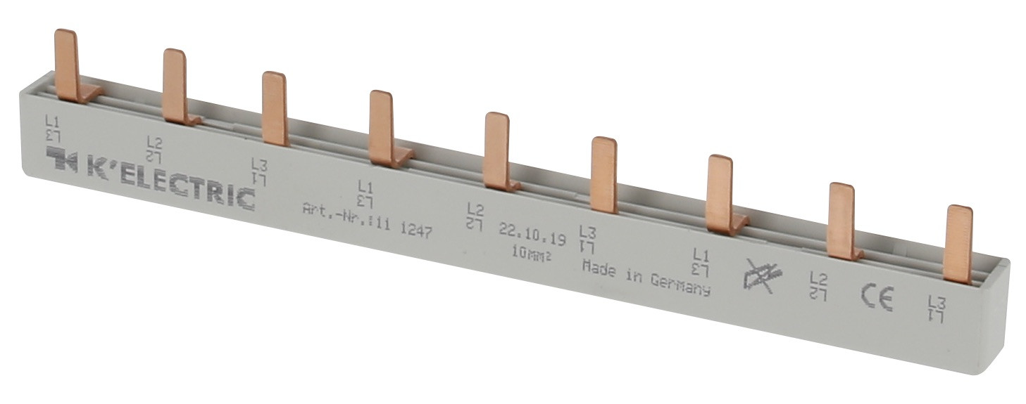 | Kurzbeschreibung | Steg-Verdrahtungsschiene, 3-polig, 10mm², 9TE, zzgl. Metallzuschläge |