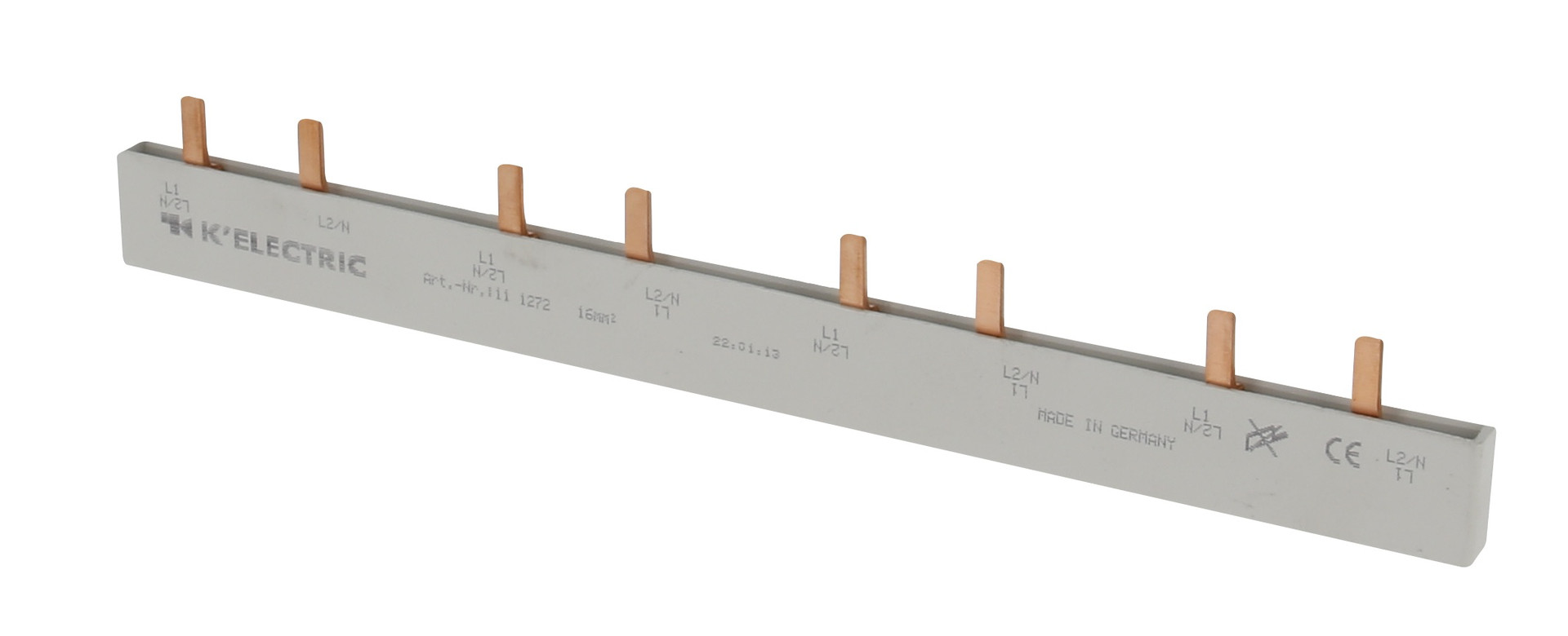| Kurzbeschreibung | Steg-Verdrahtungsschiene, 2-polig, 16mm², 8TE, 27mm, zzgl. Metallzuschläge |