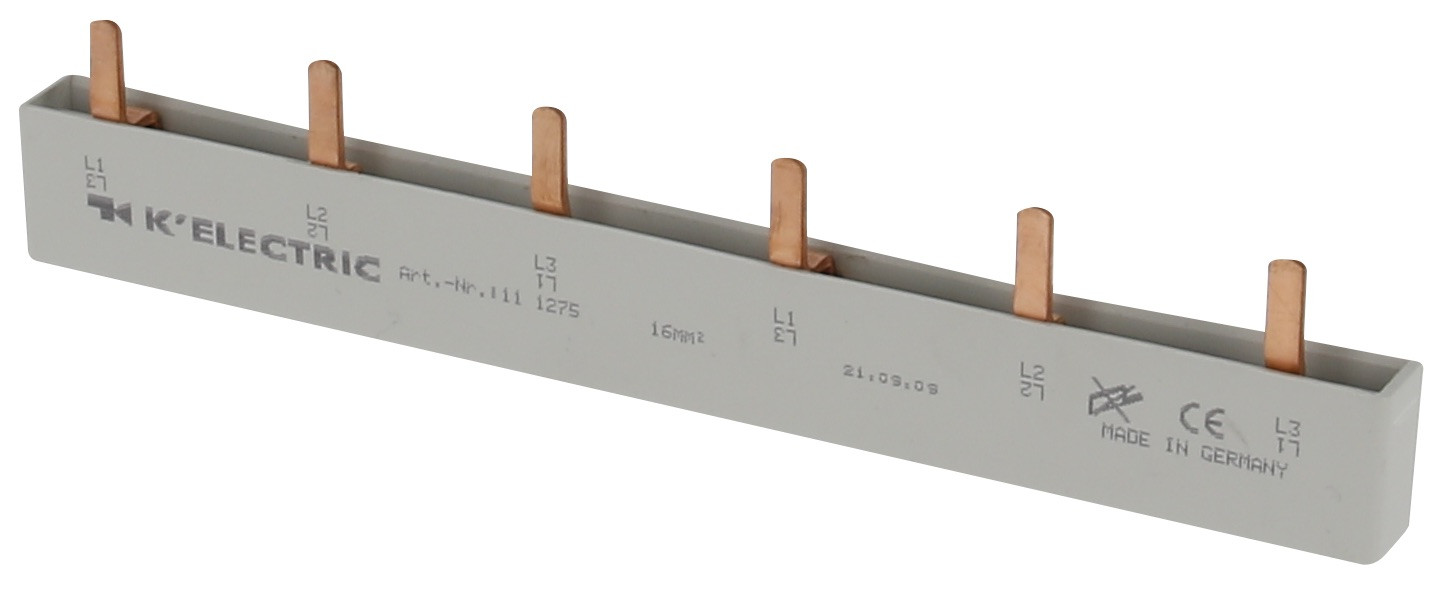 | Kurzbeschreibung | Steg-Verdrahtungsschiene, 3-polig, 16mm², 6TE, 27mm, zzgl. Metallzuschläge |