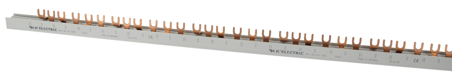 | Kurzbeschreibung | Gabel-Verdrahtungsschiene, 4-polig, L1,N,L2,N,L3,N, 10mm², 54TE, zzgl. Metallzuschläge |