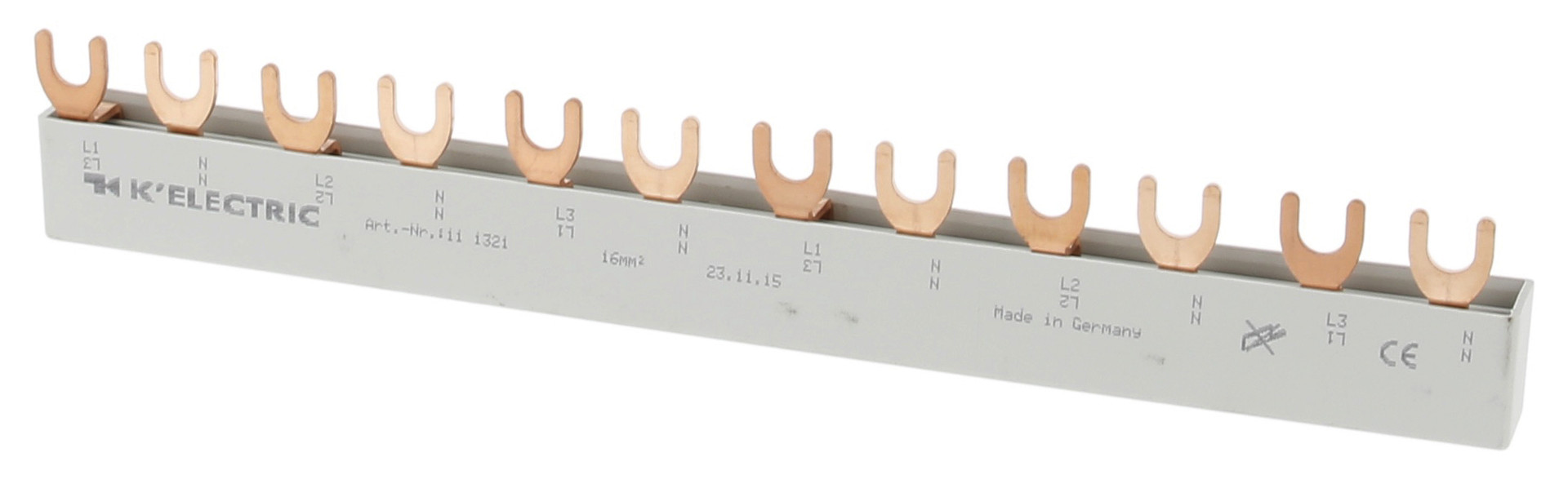 | Kurzbeschreibung | Gabel-Verdrahtungsschiene, 4-polig, L1,N,L2,N,L3,N, 16mm², 12TE, zzgl. Metallzuschläge |