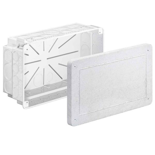 Ausbrechöffnungen für DIN EN Rohre 24 x Ø 20 mm, 12 x Ø 25 mm, 6 x Ø 32 mm, 16 obenliegende Leitungseinführungen, bestehend aus Gehäuse und Mineralfaserplatte, universelles Öffnungsmaß bis max. 199 x 102 mm, für Geräte mit einer Einbautiefe bis max. 90 mm