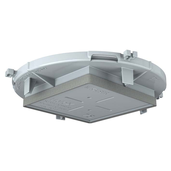 HaloX® 100 Frontteile, quadratisch für Sichtbeton (1281-69). Für die Verarbeitung im Ortbeton ist das formstabile HaloX®-System modular aufgebaut. Drei Gehäusedurchmesser mit einer Vielzahl an runden, quadratischen sowie universellen Frontteilen ermöglichen die Integration von Leuchten und Lautsprechern bis zu einem Einbaudurchmesser von 250 mm ? auch bei Sichtbeton. Mit Tunnel bietet das System ausreichend Raum für die Aufnahme von Betriebsgeräten, z. B. LED-Treiber. Optionale Verlängerungsringe dienen der Vergrößerung der Einbautiefe. Alle Frontteile sind feuchtigkeitsabweisend und können bereits vor dem Verlegen der ersten Bewehrung exakt positioniert und aufgenagelt werden. Gehäuse und Frontteile werden kraftschlüssig und stabil miteinander verrastet und lassen sich auch nachträglich noch frei ausrichten. Durch die werkzeuglose Öffnungstechnik mit Kombinationseinführung M20/M25 können Rohre einfach und schnell eingeführt werden und selbst bei Fehlbelegung lässt sich die Einführung einfach wieder verschließen. Sie bietet eine sichere Rohrrückhaltung mit Tiefenanschlag, so dass ein nachträgliches innenseitiges Kürzen der Rohre entfällt. Nach dem Vergießen lassen sich Frontteile mit definiertem Einbaudurchmesser durch einen gezielten Hammerschlag öffnen. Die Frontteile für universelle Öffnungsmaße können flächig an- oder überspachtelt werden. Anschließend erfolgt die Erstellung der gewünschten Installationsöffnung mit herkömmlichen Fräswerkzeugen, z. B. MULTI 4000. Installationsart: Ortbeton | Installationsart: Sichtbeton | Frontteil Form: Quadratischer Deckenauslass | Einbaudurchmesser Leuchte / Lautsprecher: 75 x 75 mm