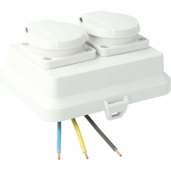 Deckel mit Doppelsteckdose AK2-C2 IP54 (AT2234). Halogenfrei: Ja | Breite: 100 mm | Tiefe: 58 mm | Länge: 125 mm | Farbe: lichtgrau | Schutzart: IP54