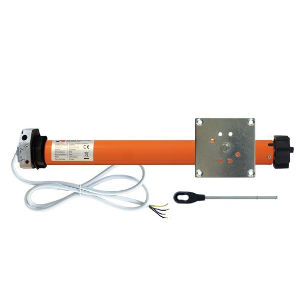 Der NHK-Rollladenantrieb Champion Classic - NHK ist ein mechanischer Rohrmotor für Rollläden bis 10qm. Bei diesem Antrieb werden die Endpunkte per beiliegendem Einstellwerkzeug an den Stellschrauben am Motorkopf eingestellt. Durch das verbaute Nothandkurbelgetriebe kann der Motor auch bei Stromausfall oder Defekt per Handbedienung hochgekurbelt werden. Das Drehmoment beträgt 50 Nm, und die Drehzahl 12 U/min. Der Motor ist insgesamt 700mm lang und der Motormantel hat einen Durchmesser von 45mm. Die Versorgungsspannung beträgt 230V (50Hz) und er ist der Schutzartklasse IP44 zugeordnet. Der Antrieb wird standardmäßig mit einem 3m Anschlusskabel sowie einer 100x100-Lagerplatte ausgeliefert. Voradaptiert ist er für eine Achtkantstahlwelle mit der Schlüsselweite 60. Mit dem erhältlichen Zubehör kann er ebenso für die Achtkantwelle SW50 & SW70 sowie einige Markisenwellen adaptiert werden.