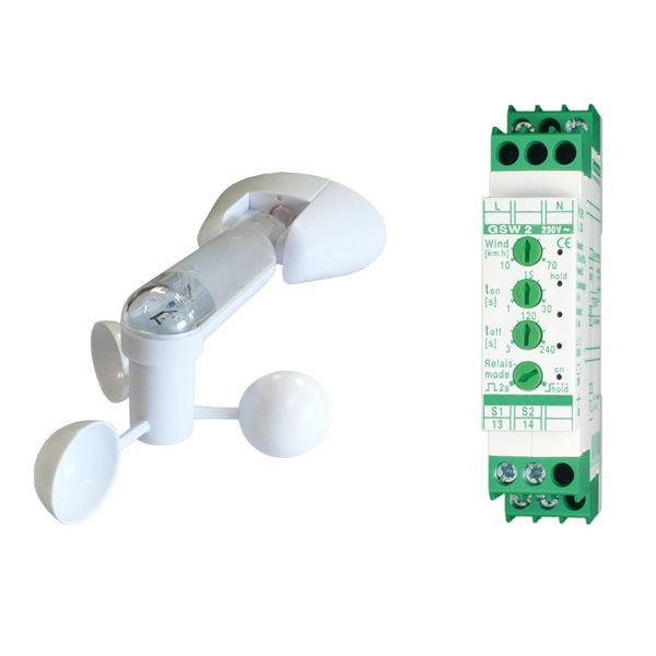 Die Windsteuerung eignet sich hervorragend, um eine Markise oder sogar hausweite Jalousiesteuerung vor windbedingten Schäden zu schützen. Während der Windsensor an der Fassade oder auf dem Dach angebracht wird, lässt sich die Auswerteeinheit einfach auf die DIN-Hutschiene setzen (1 TE). Mit den Dreh-Potentiometern an der Auswerteeinheit können Sie einerseits den Schwellwert (10, 20, ..., 70 km/h),die Vor- (1, 5, 10, ..., 30 Sekunden) und Nachlaufzeit (3-240 Sekunden) sowie der Modus (2-Sekunden-Impuls oder dauerhaft geschlossener Kontakt während der Meldephase) individuell einstellen. Wenn der Wind den eingestellten Schwellwert für die Dauer der eingestellten Vorlaufzeit überschreitet, wird die Anlage ein- bzw. hochgefahren. Nach einer dauerhaften Unterschreitung des Schwellwertes für die eingestellte Nachlaufzeit wird die Anlage wieder freigegeben. Die Versorgungs- und Schaltspannung beträgt 230V (50Hz). Der Sensor benötigt keine externe Spannungsversorgung. In dem Paket sind die HS-Auswerteeinheit und der Windsensor enthalten. Abmessungen Auswerteeinheit: 88x58x18mm, Abmessungen Windsensor: 220x80x70mm