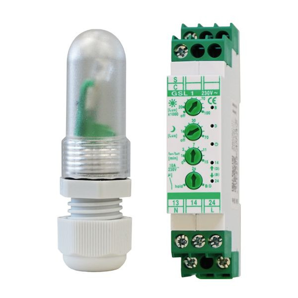 Die Sonnen- und Dämmerungssteuerung eignet sich hervorragend, um Ihre hausweite Rollladen- oder Jalousiesteuerung komfortabel zu automatisieren. Während der Lichtsensor an der Fassade oder auf dem Dach angebracht wird, lässt sich die Auswerteeinheit einfach auf die DIN-Hutschiene setzen (1 TE). Mit den Dreh-Potentiometern an der Auswerteeinheit können Sie einerseits die Schwellwerte für Sonne (20k, 30k, ..., 100k LUX) und für Dämmerung (1, 10, 20, ..., 70 LUX), sowie die Vor- und Nachlaufzeit (1, 3, 5, ..., 15 Minuten) und den Modus (2-Sekunden-Impuls oder dauerhaft geschlossener Kontakt während der Meldephase) individuell einstellen. Wenn die Schwellwerte über- bzw. unterschritten werden, wird nach Ablauf der eingestellten Zeit der entsprechende Kontakt für AUF oder AB durchgeschaltet. Die Versorgungs- und Schaltspannung beträgt 230V (50Hz). Der Sensor benötigt keine externe Spannungsversorgung. In dem Paket sind die HS-Auswerteeinheit und der Lichtsensor enthalten. Abmessungen Auswerteeinheit: 88x58x18mm, Abmessungen Lichtsensor: Höhe 65mm, Ø20mm