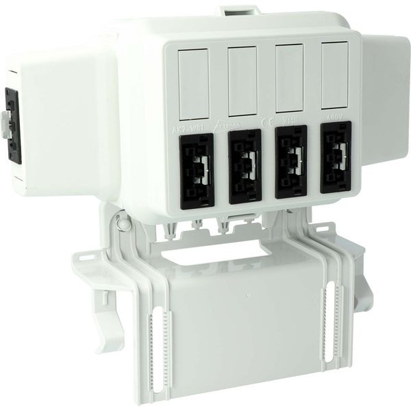 Steckbar 100% Gehäuse AK2, WAGO WINSTA® MIDI, in: 3pol sw, out:4x 3pol sw L1, inkl. Montageplatte gewinkelt (AT4734).