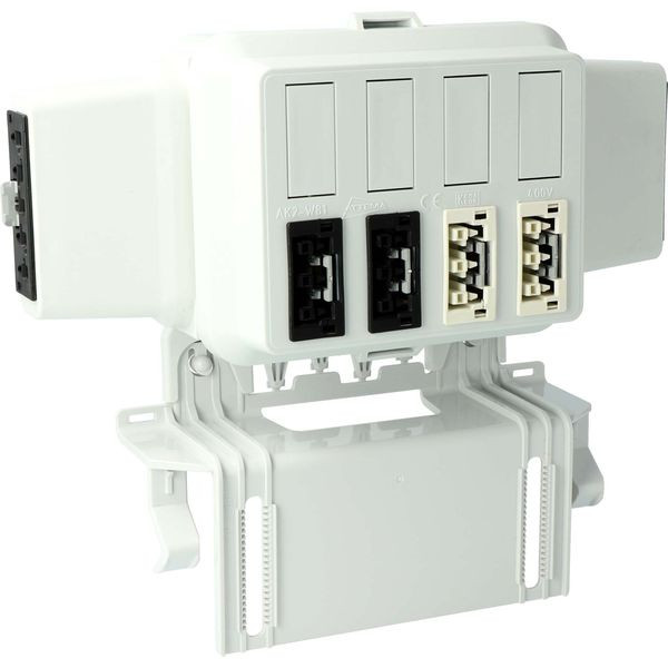 Steckbar 100% Gehäuse AK2, WAGO WINSTA® MIDI, in: 5pol sw, out:je 2x 3pol sw L1/ ws L2, inkl. Montageplatte gewinkelt (AT4743).