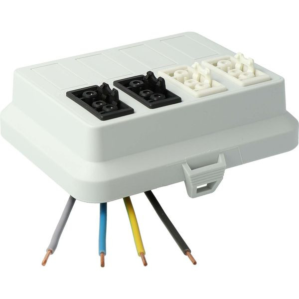 | Kurzbeschreibung | Steckbar Frontteil AK2, Wieland GST18,, in:4pol H07V-U, out:je 2x3pol swL1/ wsL2, 125x100x42 mm, lichtgrau |