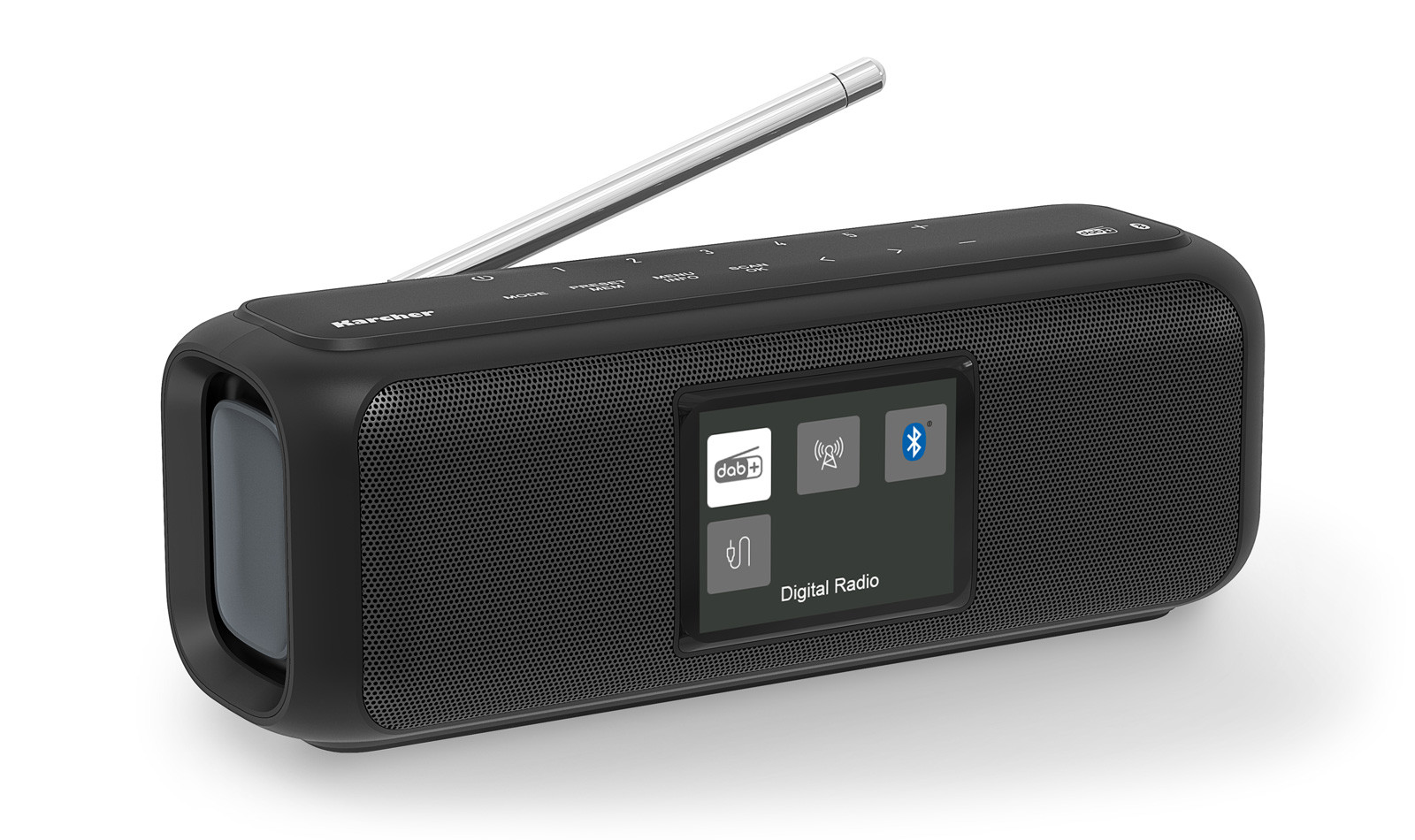 DAB+ Digitalradio, UKW-Radio (mit RDS), Bluetooth-Audio-Streaming, großes Farbdisplay, Stereo-Lautsprecher mit Passivmembranen für satten Sound, praktische Trageschlaufe, integrierter Akku