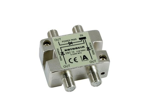 3fach-F-Verteiler 5-2400 MHz, Schirmklasse A, Anschluss fuer Potenzialausgleich, Fernsp. max. 24 V 0,5 A 3 Ausg., Entkopplungsdioden OUT-IN