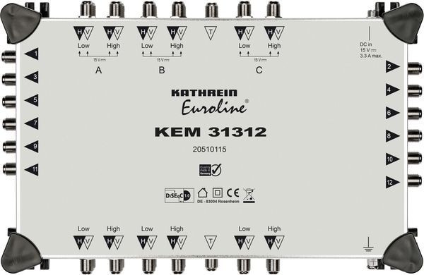 Multischalter Durchgang 13 auf 12, 13 Durchschleif- 12 Schaltausgaenge, F-Anschluesse, kaskadierbar, DiSEqC-Steuerung, externes Netzteil erforderlich