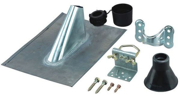 Mast-Montage-Set 48 mm, bestehend aus Mastkappe ZTC 08, Dichtkragen, Blei-Dachblech, Mastfuss, Mastschelle, Holzschrauben
