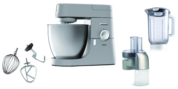 Chef XL Gehäuse aus Druckgussmetall, planetarisches Rührsystem, Hochgeschwindigkeits- und Niedrigdrehzahl-Anschluss, stufenlose Geschwindigkeitsregelung mit Impulsfunktion, Edelstahl-Rührschüssel 6,7 l für 910 g Mehl, max. Teigmenge 4,55 kg, 3-teiliges Patisserie-Set bestehend aus K-Haken, Ballonschneebesen und Knethaken, Spachtel, Spritzschutz, Schnitzelwerk mit 7 Edelstahl-Arbeitsscheiben, Acryl-Mixaufsatz