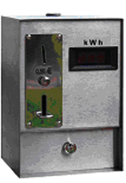 3-stellige kWh-Anzeige (Restenergie-Anzeige) Modell 7000 E – Mikroprozessor gesteuert leistungsabhängig, zur kWh-Abgabe, Spannung: 230 V, 50 Hz, Schaltstrom: 16 A, AC 1, Gehäuse: Edelstahl-rostfrei (2 mm) geschliffen. Max. Speicherwert: 255 kWh, Wert frei einstellbar von 1-255 kWh pro Münze, 4-stellige kWh-Anzeige (Restenergie-Anzeige), hochwertiger Münzprüfer mit Falschgeldrückgabe Höhe: 216 mm, Breite: 150 mm, Tiefe: 130 mm