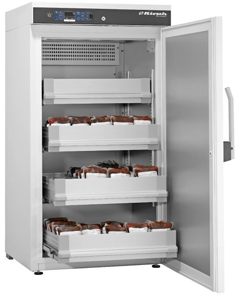 nach DIN 13277 (ersetzt DIN 58371), Touch-Display, kapazitiv, edles Glasdesign, grafische Anzeige des Temperaturverlaufs mit Logbuchfunktion, Zugangskontrolle über Passworteingabe oder RFID möglich, PC-KIT-NET zur Temperaturdokumentation und -überwachung über LAN. Ausstattung: Umluftkühlung, 4 Schubfächer aus Aluminium, automatische Abtauung, Tauwasserverdunstung, potentialfreier Kontakt, digitale Temperaturanzeige, Komfortzugang, Gefrierschutz, optisches und akustisches Alarmsignal, auch bei Stromausfall, Minimum-/Maximum-Temperaturspeicher