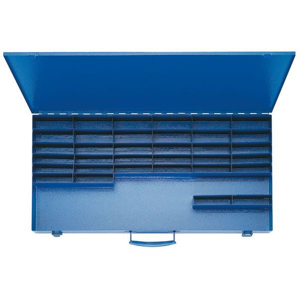 Hammerschlaglackierter Sortimentskasten, 34 kleinere und 1 größeres Leerfach mit Verschluss und Tragegriff. Zur Aufbewahrung von 34 Paar Presseinsätzen und dem Presswerkzeug K 18. Abmessungen 605x300x50 mm, Gewicht: 4,6 kg.