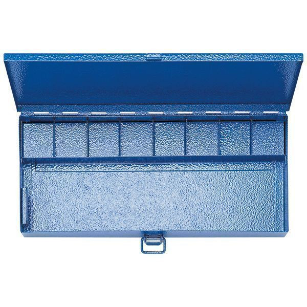Hammerschlaglackierter Sortimentskasten, 8 kleinere und 1 größeres Leerfach mit Verschluss. Zur Aufbewahrung von 8 Paar Presseinsätzen und dem Presswerkzeug K50. Abmessungen 245x130x37 mm, Gewicht: 0,7 kg.