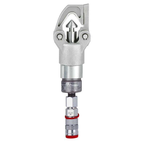 Extra großer Pressbereich aufgrund des innovativen 2-stufigen Teleskopzylinders (patent pending). Dornpressung - es ist kein Wechseln von Einsätzen erforderlich. Geschlossener Kopf, aufklappbar, drehbar. Zum Anschluss an hydraulische Pumpen mit 700 bar Betriebsdruck für optimale Ergebnisse.